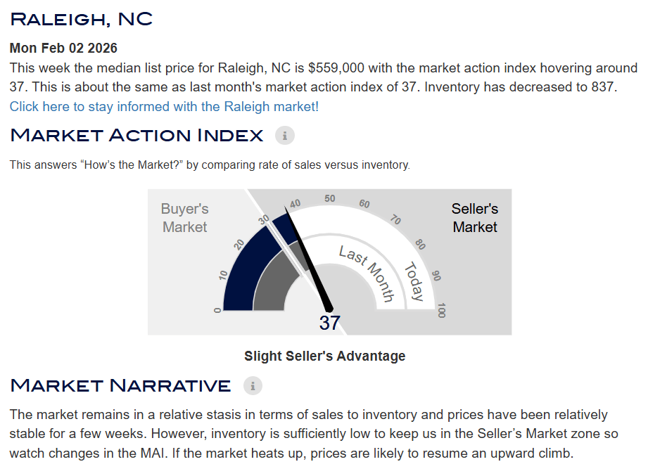What it means: The Raleigh market is holding steady, with prices staying firm and inventory still on the low side. Buyers have a bit more time and flexibility than before, but well-priced homes are still moving. Sellers still have a slight edge, especially when strategy and presentation are dialed in.