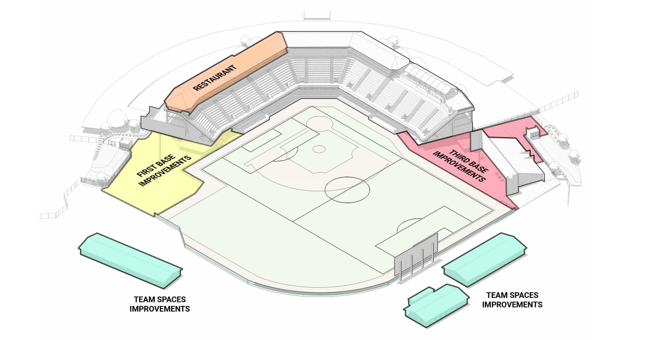 Planned upgrades: synthetic turf, new outfield walls, enhanced lighting, locker room overhauls, and family-friendly gathering areas.